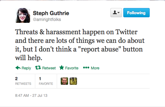 Or at least, so far it has been mostly consequence-free, but that is beginning to change. Two of the Twitter users who threatened Criado-Perez are under arrest. Twitter UK published a blog post outlining their responses to the situation, including the much-discussed “Report Abuse” button and updating the Twitter Rules to reflect a firm stance on abuse. Changes to the rules are welcome. That sends an important message to Twitter users and the business community about online violence, and may give some in-platform recourse to users under attack.